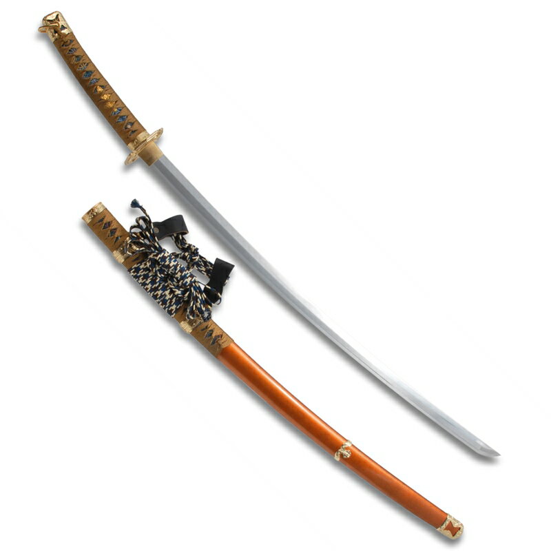 模造刀 太刀 陣太刀 梨地塗り鞘 極上研磨刀身(gst-sd9-1908)(横掛台・刀袋付)大刀 日本刀 美術刀剣(代引き不可)太刀陣太刀梨地塗り鞘◆台サイズ◆幅約41.2×奥行15.6×高さ32.5cm◆刀身サイズ◆全長:約106cm刃渡:約70.5cm柄長:約25.5cm◆刀身重さ◆総重量:約1330g(鞘を払って約930g)◆刀身仕様◆刀身:硬質合金刃文:直刃刃文刀身仕上:極上研磨刃文◆仕様◆鞘:梨地塗り/金具:太刀揃え金具吊革:牛本皮(黒)鍔:四方猪目透かし太刀鍔・合金製柄:西陣織裂地下地綿糸金茶捻り巻き/柄下地:朴木縁頭金具:太刀揃え・合金製目貫:龍図・合金製掛台:刀一本横掛台刀袋:紫(裏地付き)美濃の国、関は鎌倉時代の昔から幾多の名匠が育った。